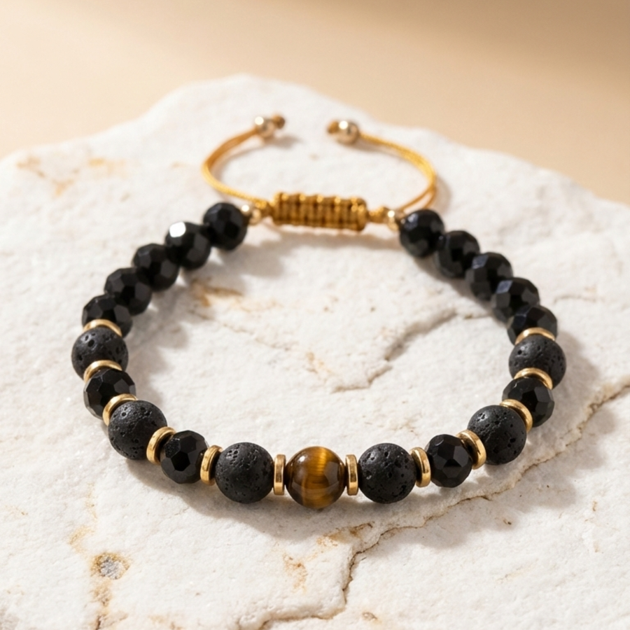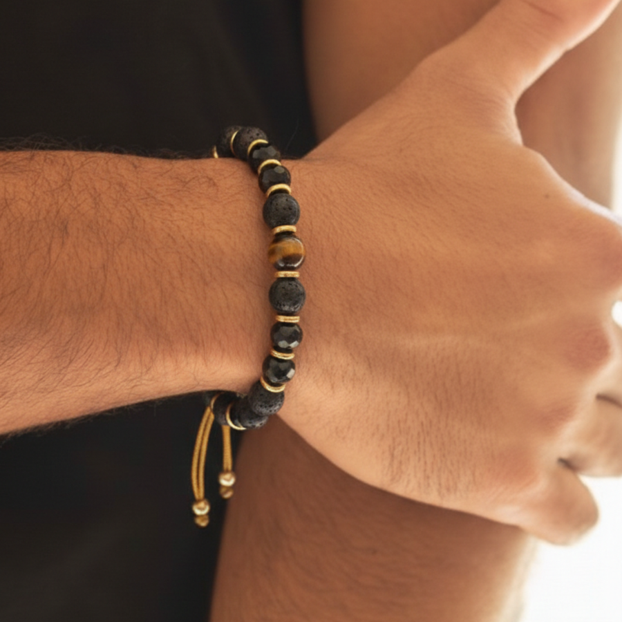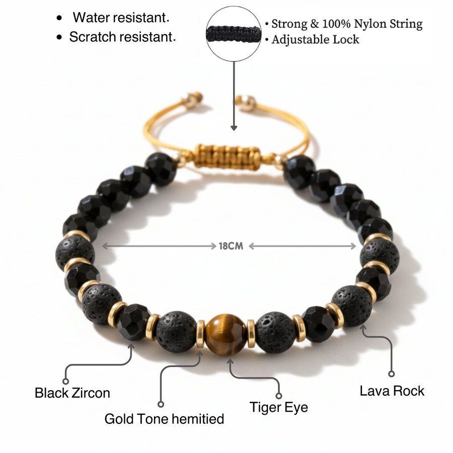- Stones: 8mm Tiger Eye, 8mm Black Quartz, 8mm lava rock
